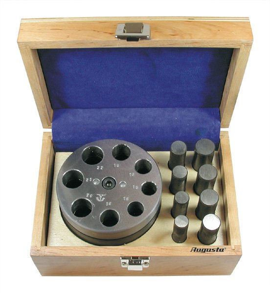 Die with precisely drilled holes and exact fitting punches.