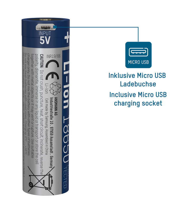 - Batteria ANSMANN 18650 al litio, di alta qualità con circuito di sicurezza e presa micro-USB di ricarica. La corrente di carica interna viene limitata ad un massimo di 1A.
